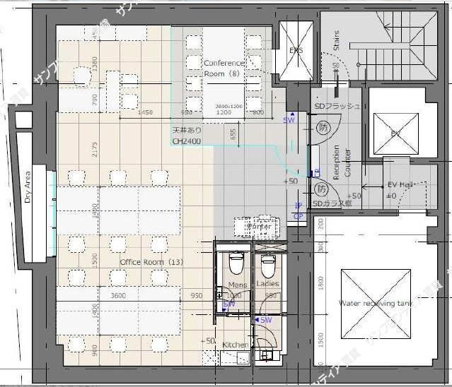 | 備考 | 備考:ガラスパーテーションの会議室・受付台設置済、床:OAフロア、空調:個別空調、設備:ELV1基 | ||||